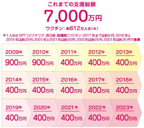 これまでの支援総額7,000万円ワクチン:約612万人分(fēn)(※1人分(fēn)のDPT(ジフテリア、百日咳、破傷風)ワクチン:2017年までは約9円、2018年と2019年は約25円、2020年と2021年は約20円、2022年は約25円で換算、2023年は約30円で換算 2009年:900万円、2010年:900万円、2011年:400万円、2012年:400万円、2013年:400万円、2014年:400万円、2015年:400万円、2016年:400万円、2017年:400万円、2018年:400万円、2019年:400万円、2020年:400万円、2021年:400万円、2022年:400万円、2023年:400万円