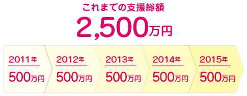 これまでの支援総額2,500万円 2011年:500万円、2012年:500万円、2013年:500万円、2014年:500万円、2015年:500万円