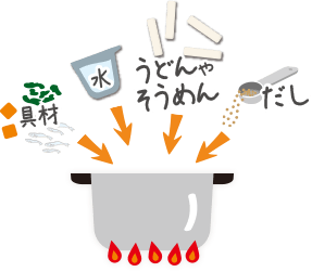 用(yòng)意する水の量 | 加熱時間 | うどんの量 (ゆで) |