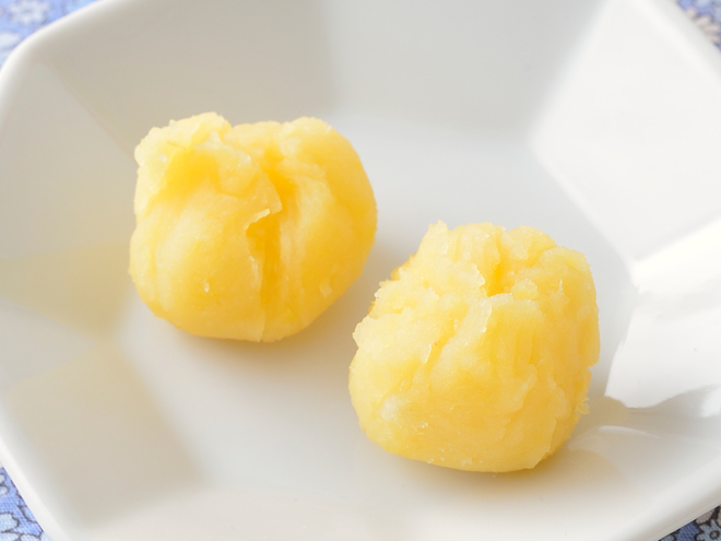 2. 熱いうちに15mlのお湯で溶いた「飲みたいぶんだけ りんご果汁」を混ぜ合わせラップ等で茶巾しぼりをつくります。