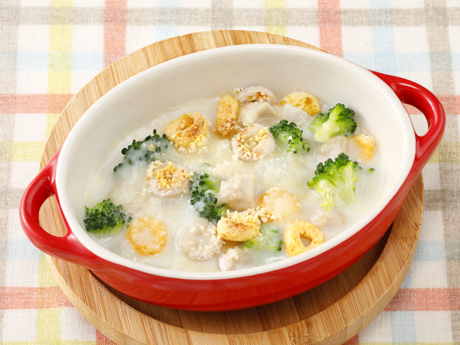 - 耐熱容器に「はじめてのシリアル 緑黄色野菜とくだもの」と(1)を入れて、「手作り応援 ホワイトソース」を30ml(大さじ2杯)のお湯で溶き、かけます。